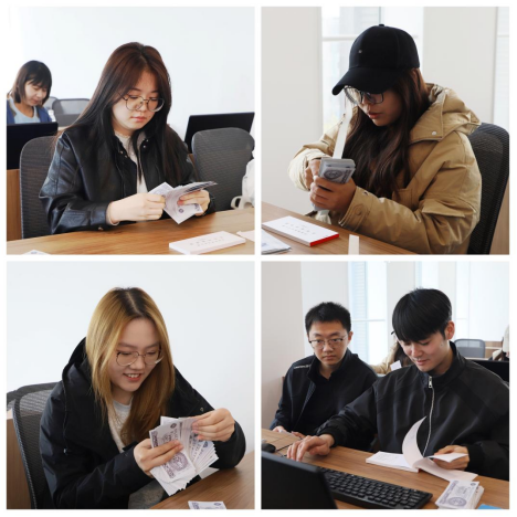 座谈会上,农商行为大家带来“理财有道,反诈有招”知识宣讲,深入浅出地讲解了理财产品的估值方法(摊余成本法与市值法)、风险匹配原则及资产配置策略。同时,聚焦点钞、翻打传票、假币识别、字符录入等柜面核心实操技能,工作人员手把手示范单指单张、单指多张等方法,一对一纠正学员操作误区。同学们反复练习、打磨技巧,提前熟悉银行从业人员工作要求。
