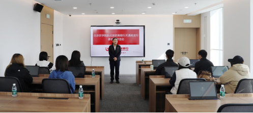 师生赴北京农商银行天通苑支行开展研学活动。活动伊始,双方共同观看了北京农商银行天通苑支行宣传片。人力资源部总经理陈萌介绍了北京农商银行天通苑支行的发展情况、天通苑支行队伍建设等情况。