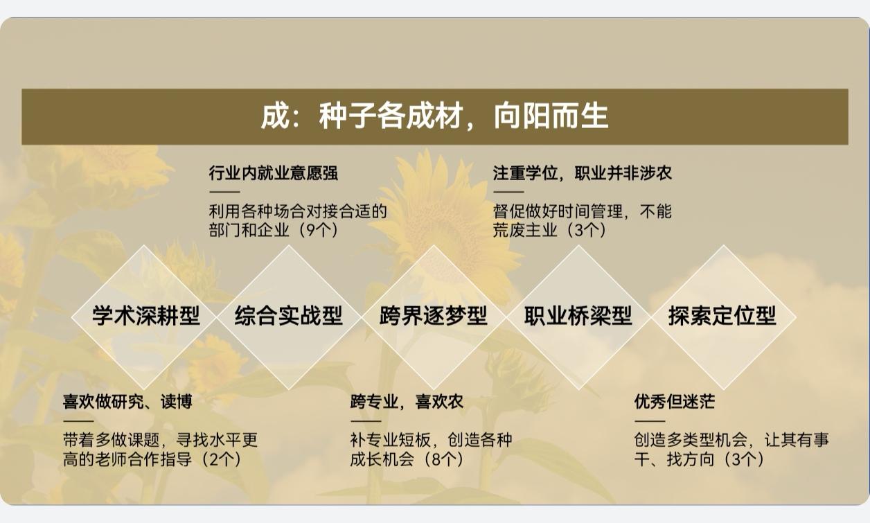“我的职责不是培养一模一样的人才,而是守护每一颗不同的种子,让它们在北农以及乡村这片土地上都能向阳而生,长成最好的自己。”江晶老师的育人智慧,集中体现在她那独具匠心的分类培养方式。对于学术深耕型的2名学生,他们热爱研究,江老师不仅带他们多做课题,还主动联系高水平专家进行联合指导,帮他们夯实理论根基。对于综合实战型的9名学生,他们愿意在各行业就业,江老师利用各种场合积极对接合适单位,为他们搭建从校园到职场的桥梁,多名毕业生进入政府部门、央企、涉农企业等单位。对于跨界逐梦型的8名学生,他们跨专业但对“三农”情深意笃,江老师倾情补上专业短板,创造与新农人交流的成长机会,多名毕业生到街道、乡镇、农服中心工作。对于职业桥梁型的3名学生,他们的就业意向非涉农,江老师督促他们做好时间管理,兼顾专业学习与求职准备,现在均已顺利毕业并找到自己喜欢的工作。对于探索定位型的3名学生,他们优秀却方向迷茫,江老师为他们创造多类型、多场景的实践舞台,让他们在干中找到方向,如今,他们正在各行各业发光发热。