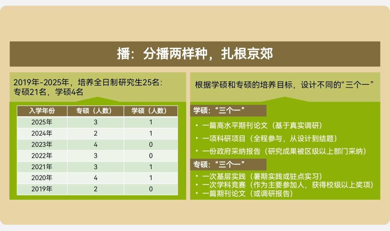 江晶老师深知,学硕和专硕好比乔木与灌木,需要不同的土壤和养分。2019年至2025年,江晶老师共培养全日制研究生25名,其中专业硕士21名、学术硕士4名。针对两类学生,在学生培养要求的基础上,她分别设计了三项目标任务。对于学术型硕士,要求完成一篇基于真实调研的高水平期刊论文,全程参与一项从设计到结题的科研项目,并产出一份能被区级以上政府部门采纳的研究成果报告,希望学硕在参与政策研究全链条中真正理解学术如何服务现实决策。对于专业型硕士,则要求至少一次深入基层的暑期实践或驻点实习,参加一次学科竞赛,独立完成一篇期刊论文或高质量调研报告,让他们在田间地头和竞赛场上锤炼实战本领。为了研究真问题,她带领学生走遍北京市13个主要涉农区、100余个乡村、200余个新型农业经营主体基地,学生们真正理解了“把论文写在祖国大地上”的深刻内涵。