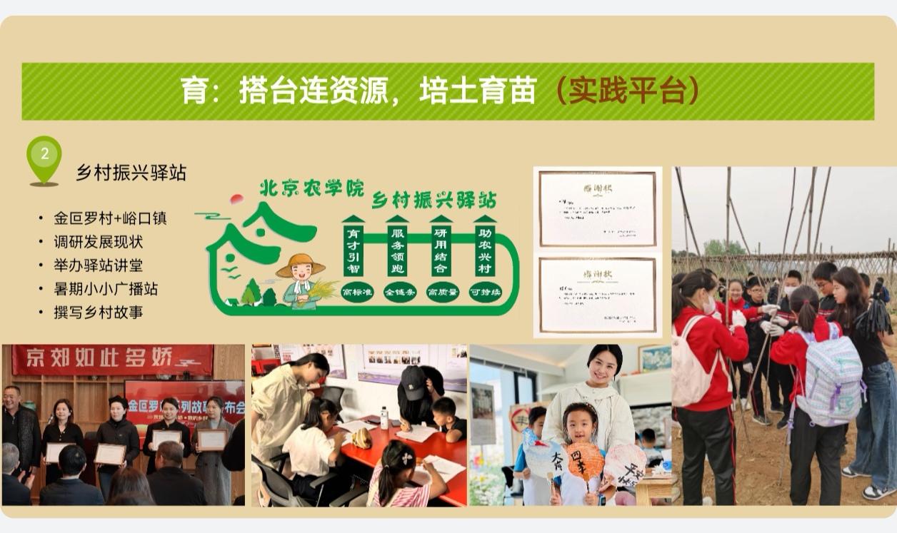 江晶老师坚信,育人不仅在于知识的传递,更在于能力的点燃与平台的搭建。她将科研项目、学科竞赛、科技小院、乡村振兴驿站等载体构筑为学生知行合一的练兵场。在科研平台上,她指导学生全程参与5项省部级项目和11项政府委托课题,学生以第一作者发表论文12篇,11名学生参与撰写的调研报告获主管部门采纳,部分成果直接转化为政府决策。在实践平台上,指导通州区西集镇沙古堆村樱桃科技小院驻院学生从科技、美学、融合、活动四方面赋能,开发樱桃蜜产品,打造可食花园与日落光语夜间场景,设计农耕研学课程,并联合北京农业电商协会成立电商赋能工作站,带动周边农户樱桃售卖100万元以上,农场营业收入和游客量均同比增长10%以上,带动新增就业近百人;指导密云溪翁庄镇金叵罗乡村振兴驿站两名研究生建立“暑期小小广播站”,撰写金叵罗村系列故事,举办“11队”大讲堂,策划乡村旅游线路,获得当地高度认可。在学科竞赛上,她指导学生荣获省部级以上竞赛奖励15项。其中,跨学科团队完成的《绝境逢生:要素重组“老”资源,产业重构“新”经济——基于187个乡村的调查研究与实践落地》荣获第十九届“挑战杯”全国大学生课外学术科技作品竞赛主体赛二等奖;《农业中关村助力乡村振兴,打造农科第一镇》夺得“青创北京”2024年“挑战杯”首都大学生创业计划竞赛“青振京郊”乡村振兴专项赛金奖。