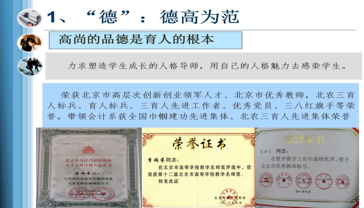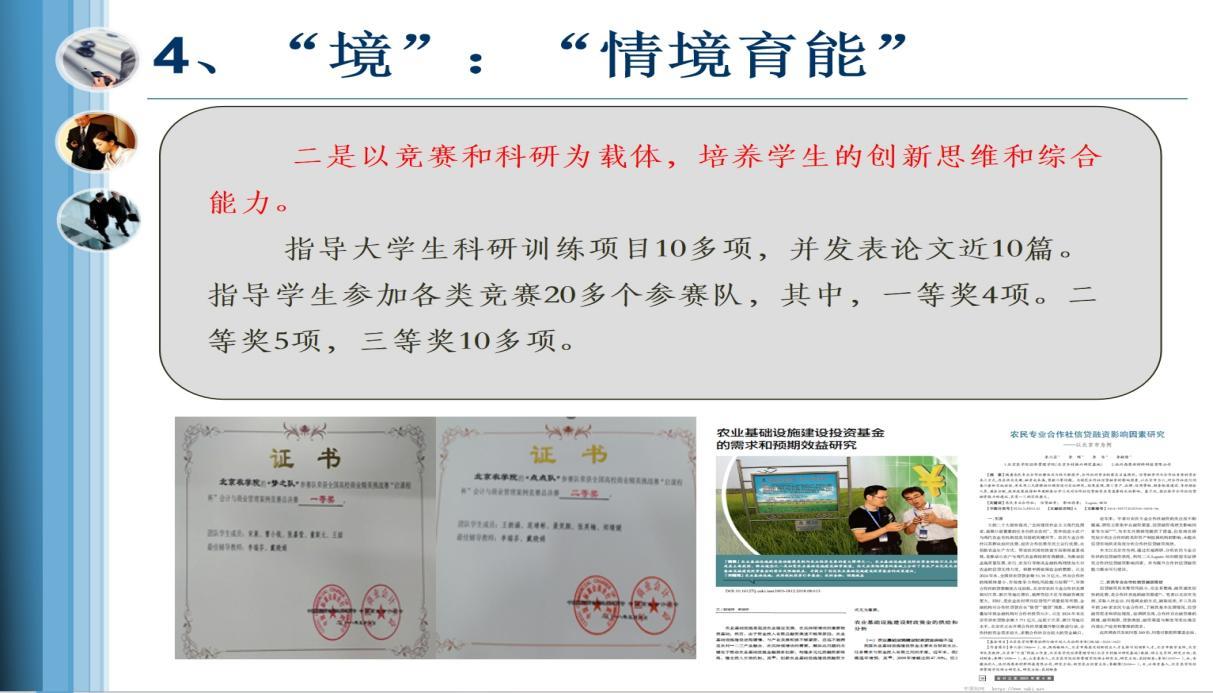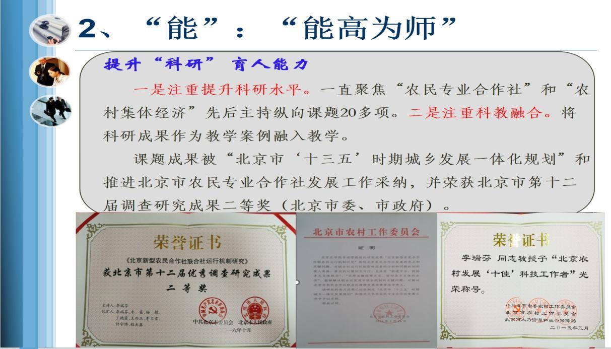 作为会计学专业的“守门人”,她将《会计学原理》这门入门课程,视为“入门育素养”的关键一环。她带领课程团队,将其建设成为北京市课程思政示范课程和优质课程,配套教材亦获评优质,为学生扣好了专业学习的第一粒扣子。她的讲台不止于校园,多年来,她将研究目光聚焦于京郊大地的“农民专业合作社”与“农村集体经济”,主持各级课题20余项。她的研究成果多次被北京市相关规划与政策文件采纳,荣获北京市调查研究成果二等奖,一些对策建议更被《成果要报》《首都咨政》等内参选登,真正实现了将论文写在京郊大地上的承诺。她也因此被授予“北京市农村发展十佳科技工作者”等称号。这些来自田野的、鲜活的科研案例,被她巧妙地反哺于课堂,让学生在掌握理论知识的同时,也触摸到中国乡村发展的真实脉搏。